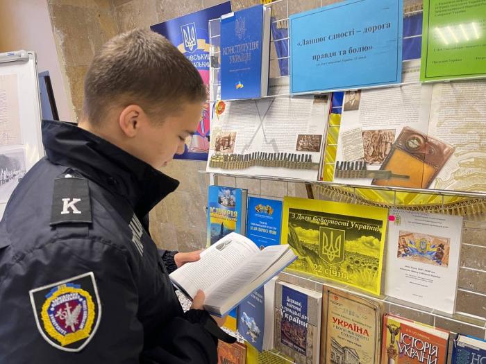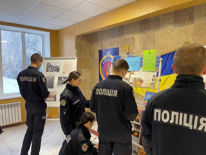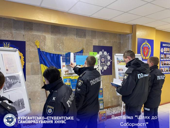 З нагоди Дня Соборності України за ініціативи курсантської ради ННІ №1 в університеті відбулася тематична виставка-інсталяція «Шлях до Соборності» – символічна експозиція, що поєднала історію, пам’ять і глибокі сенси. До створення виставки долучилися працівники бібліотеки ХНУВС, які підготували книжково-ілюстровану добірку, що стала її історичним підґрунтям.