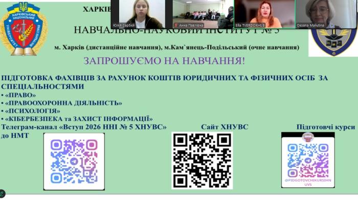 Старшокласників поінформували про основні напрями діяльності Харківського національного університету внутрішніх справ, умови вступу, особливості навчання та можливості подальшого працевлаштування і проходження служби в органах системи МВС. Окремо було розглянуто освітні програми ННІ №5 та вимоги до вступників.