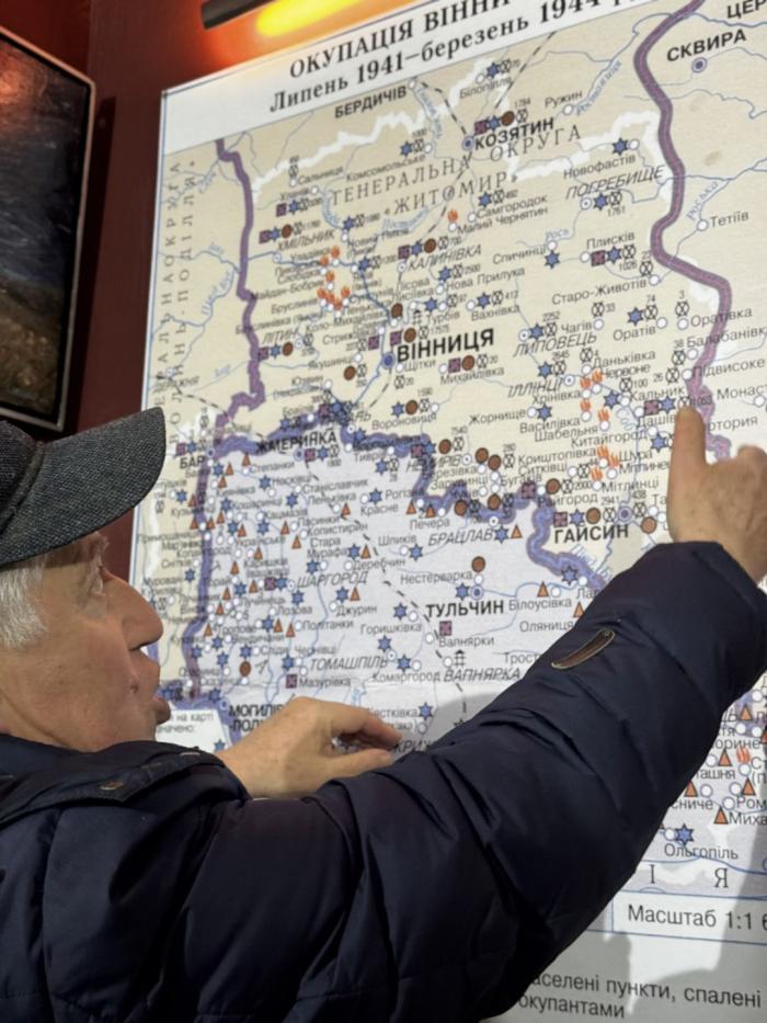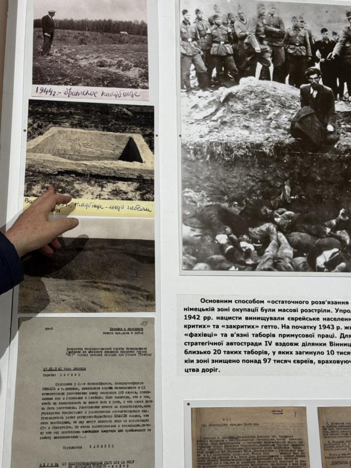Окремий розділ експозиції присвячено місцям масових страт і поховань на території Вінницької області, де в роки нацистської окупації відбувалися розстріли мирного населення. Директор музею Леонід Трахтенберг розповів про історію єврейських громад регіону, їхнє довоєнне життя та події, що призвели до їхнього знищення.