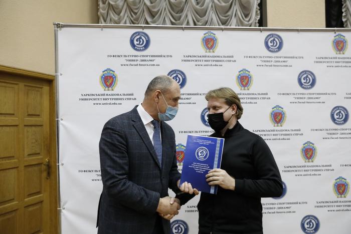 The meeting was opened by the Rector of university, who noted that much attention is paid to university sports, as good physical training is a mandatory component in the process of training police officers. Every year, cadets and students of university demonstrate high achievements in various sports, worthily representing our state and university. This year, following the results of the team championship of complex competitions in non-Olympic sports under the program “Dynamiada 2021” among the national teams of territorial organizations of the society, as well as national teams of higher education institutions belonging to the Ministry of Internal Affairs, Kharkiv National University of Internal Affairs took first place. The Cup and the Diploma of the Rector of University were presented by the Minister of Internal Affairs of Ukraine, Chairman of the FCS “Dynamo” of Ukraine Denys Monastyrskyi on November 16 during the conference of the Sports Association “Dynamo” of Ukraine in Kiev.