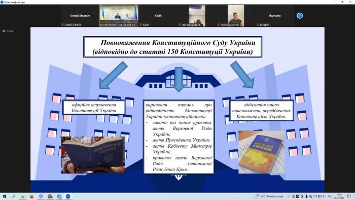 Students and lecturers of Sumy branch of Kharkiv National University of Internal Affairs once again had the opportunity to meet online and listen to a lecture by judges of the Constitutional Court of Ukraine on the topic "Activities and Powers of the Constitutional Court of Ukraine".https://univd.edu.ua/uk/news/15806