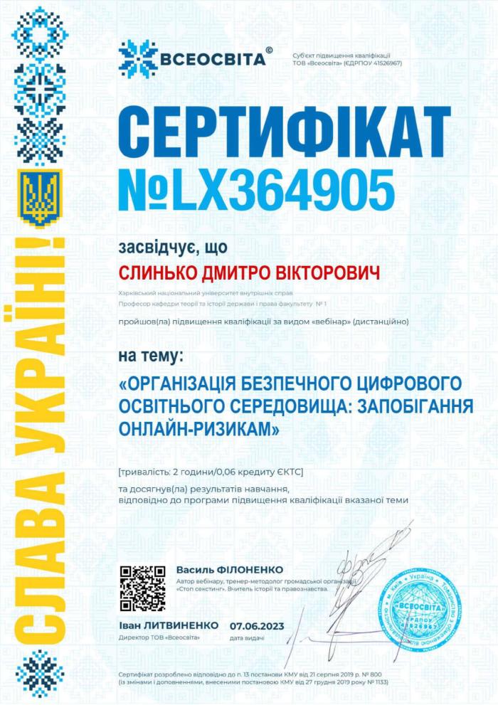 Dmytro Slynko, Professor of the Department of Theory and History of State and Law of the Faculty No. 1 of KhNUIA, took part in the webinar "Organization of a Safe Digital Educational Environment: Prevention of Online Risks" held on the National Educational Platform "Vseosvita". https://univd.edu.ua/uk/news/16480