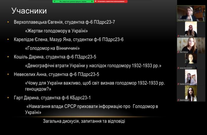 On the Day of Commemoration of the Holodomor Victims, Professor Volodymyr Hrechenko, Head of the Department of Social and Humanitarian Disciplines of the Faculty № 6, and Oksana Maliutina, Associate Professor of the same department, held a roundtable discussion. https://univd.edu.ua/uk/news/17945
