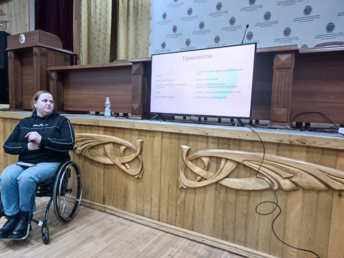 A meeting was held for the cadets of the Faculties № 2 and № 3 of KhNUIA with Liudmyla Netskina, the head of Harmoniia NGO, which deals with the problems of people with disabilities in Vinnytsia region. The event was organized by the Department of Social and Humanitarian Work on the occasion of the Day of People with Disabilities. https://univd.edu.ua/uk/news/18061