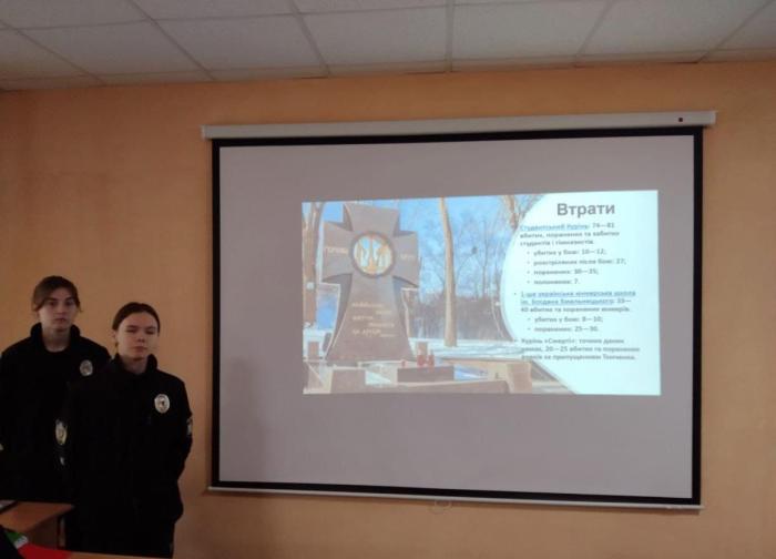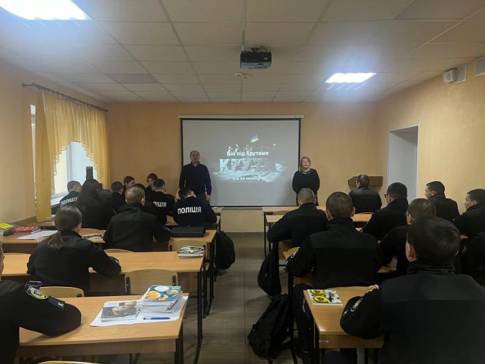 Within the framework of the curatorial hour, Andrii Siadrystyi, Senior Lecturer of the Department of Legal Disciplines of Sumy Branch of KhNUIA, together with Hanna Mititiel, a leading specialist of the Human Resources Department, held a patriotic event "Nemerknuchi Kruty" for the 1st year cadets. https://univd.edu.ua/uk/news/18629