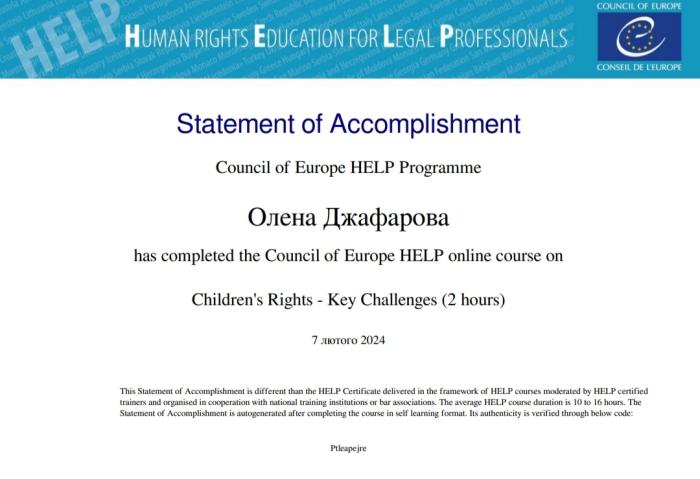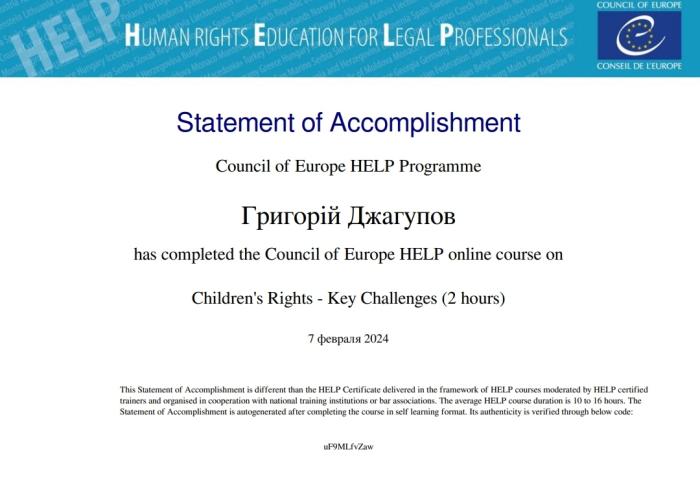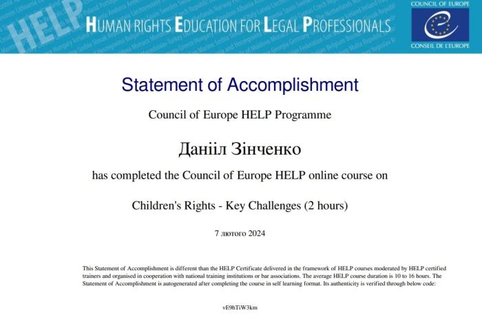 The Council of Europe HELP course on "Children's Rights - Key Challenges" was attended by the Dean of the Faculty № 3 Hennadii Zvirianskyi, his Deputy for Educational and Methodological Work Hryhorii Dzhahupov, Head of the Department of Police and Public Administration Olena Dzhafarova, Head of the Research Laboratory on Pre-trial Investigation Serhii Shatrava and Master's student of the Faculty № 3 Daniil Zinchenko. https://univd.edu.ua/uk/news/18708