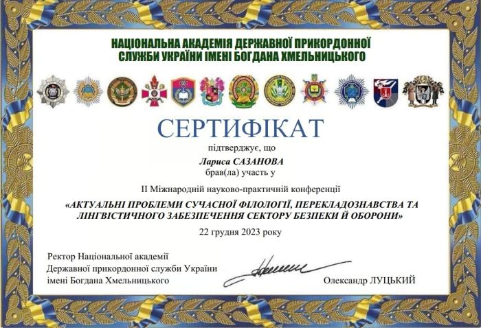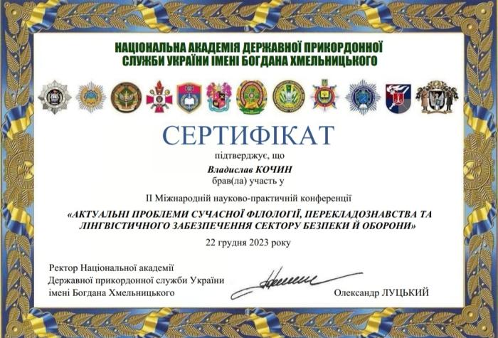 Valentyna Kochyna, Associate Professor of the Department of Foreign Languages of the Faculty № 4, Larysa Sazanova, Senior Lecturer of the same department, and 1st year cadets of the Faculty № 4 Daryna Oliinyk, Artem Hromovych and Vladyslav Kochyn participated in the II International Scientific and Practical Conference "Actual Problems of Modern Philology, Translation Studies and Linguistic Support of the Security and Defense Sector". https://univd.edu.ua/uk/news/18743
