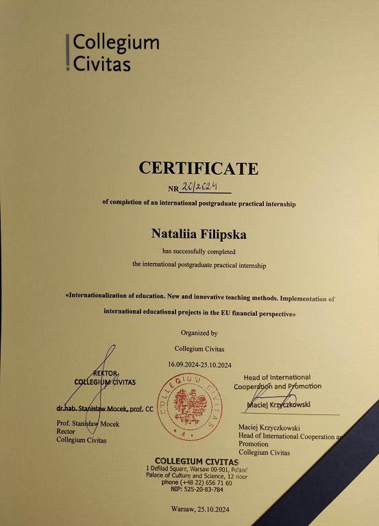 Senior lecturer of the Department of Constitutional and International Law and Human Rights, candidate of legal sciences Nataliia Filipska completed an internship at Collegium Civitas on the topic "Internationalization of Education. New and Innovative Teaching Methods. Implementation of International Educational Projects in the EU Financial Perspective". https://univd.edu.ua/uk/news/21283