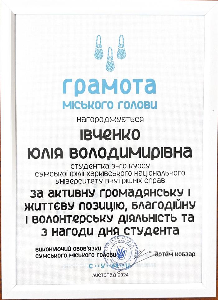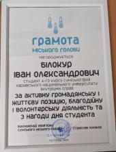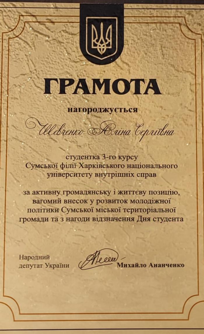 Representatives of the student and cadet self-government of Sumy branch were awarded Diplomas of the Mayor and People's Deputy of Ukraine Mykhailo Ananchenko for their active civic and life position, charitable and volunteer activities for a significant contribution to the development of youth policy of Sumy city territorial community. https://univd.edu.ua/uk/news/21409