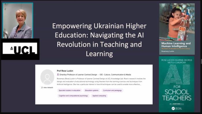A lecture by Rose Luckin, Emeritus Professor of University College London (UK) on the topic: "Strengthening Ukrainian Higher Education: Orientation in the AI Revolution in Teaching and Learning" was listened to by Andrii Voitsikhovskyi, Professor of the Department of Constitutional and International Law and Human Rights of KhNUIA. https://univd.edu.ua/uk/news/21797
