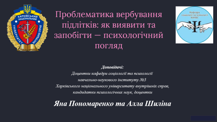 Associate professors of the Department of Sociology and Psychology of the ERI No. 5, candidates of psychological sciences Yana Ponomarenko and Alla Shilina acted as speakers at an extended meeting dedicated to the topic "Joint work of educational institutions, the parent community, law enforcement agencies and social services to prevent the recruitment of children and their involvement in subversive activities." https://univd.edu.ua/uk/news/22006