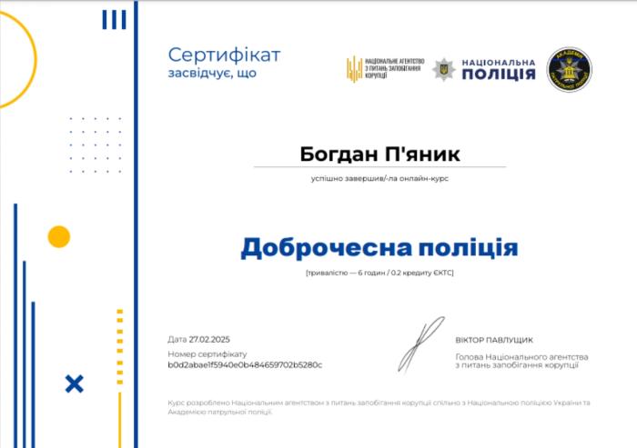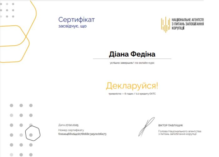 In order to raise awareness among higher education applicants of Kharkiv National University of Internal Affairs, cadets, as part of non-formal (informal) education, underwent training on the topics: "Declare!", "Honorable Police", "It's Clear About Conflict of Interest." https://univd.edu.ua/uk/news/22879