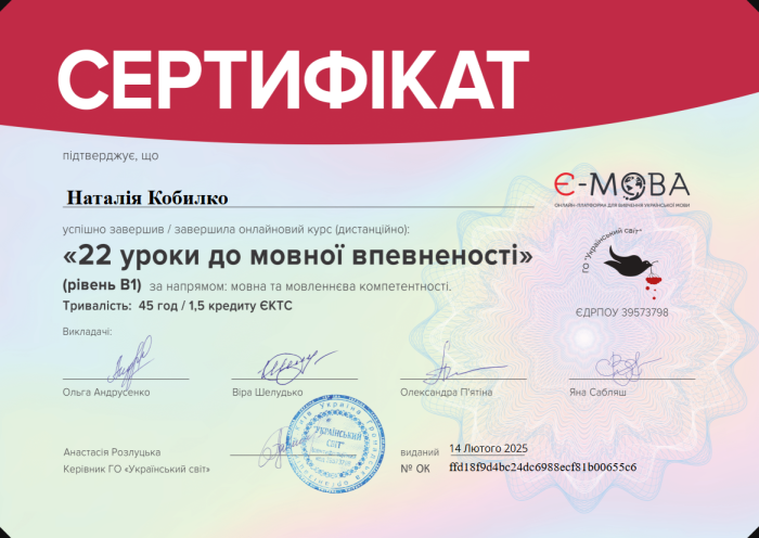 Associate Professor of the Department of Humanities and Ukrainian Studies, Candidate of Philological Sciences Natalia KOBYLKO has mastered two online courses on the educational platform "E-language". The course "22 Lessons to Language Confidence" is aimed at improving communication skills in the Ukrainian language in everyday life. https://univd.edu.ua/uk/news/23042