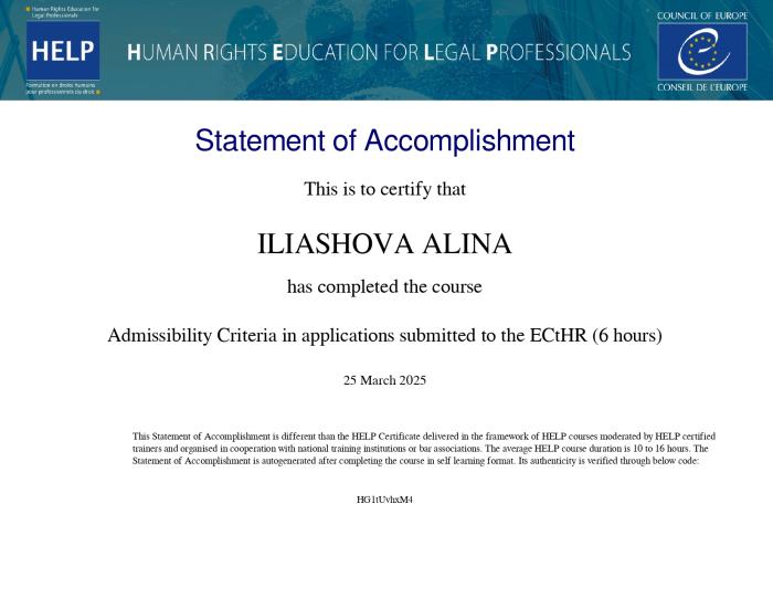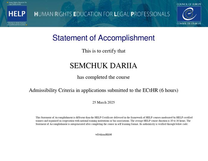 Deputy Director for Educational and Research Activities of the ERI No. 2, Candidate of Pedagogical Sciences, Associate Professor Serhii HIRENKO, as well as cadets Alina ILIASHOVA and Daria SEMCHUK successfully completed the online course "Human Rights Education for Legal Professionals" on the topic "Criteria for Admissibility of Applications Submitted to the ECtHR." https://univd.edu.ua/uk/news/23232