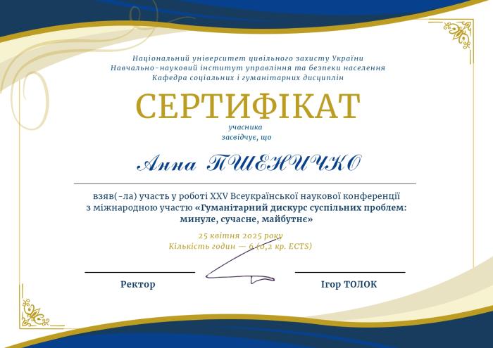 Students of the ERI No. 5 took part in the XXV anniversary All-Ukrainian scientific conference with international participation "Humanitarian Discourse of Social Problems: Past, Present, Future", organized by the National University of Civil Defense of Ukraine (Cherkasy). https://univd.edu.ua/uk/news/23698
