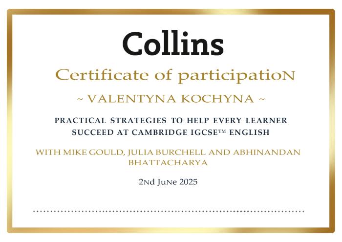 The scientific and pedagogical staff of the Department of Language Training of KhNUIA took part in the International Online Webinar "Practical Strategies to Help Every Learner Succeed at Cambridge IGCSE™ English", organized by speakers from Collins. https://univd.edu.ua/uk/news/24275