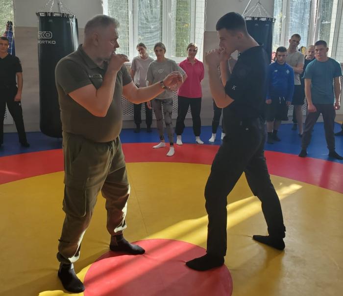 Senior lecturer of the Department of Special Physical Training of the ERI No. 2 Mykhailo INSHEKOV and lecturer Andrii LADYNIAK conducted a lesson for students of the ERI No. 4 on the topic "Improving the technique of performing strikes with hands and feet. Combined actions". The event was held with the participation of international master of sports Valerii HALAN. https://univd.edu.ua/uk/news/25105