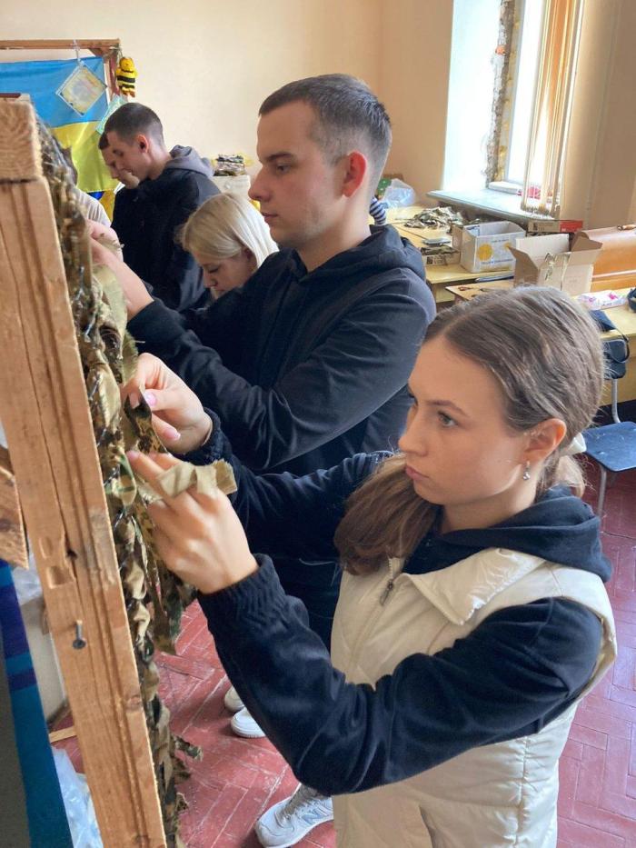 Students of Sumy branch of KhNUIA, together with representatives of the student-cadet self-government and the Legal Clinic, under the leadership of Oksana SITALO, a senior lecturer at the Department of Legal Disciplines, visited a volunteer group. The young people joined in weaving camouflage nets for the needs of the military. https://univd.edu.ua/uk/news/25118