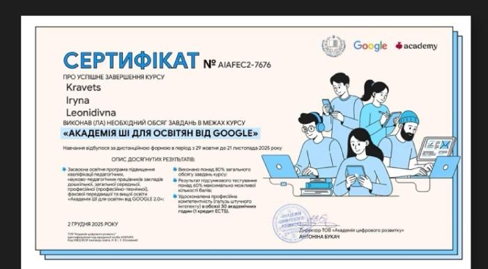 Professor of the Department of Language Training Larysa Dudikova and Senior Lecturers of the same Department Iryna Kravets, Nataliia Prozar, Larysa Sazanova and Tetiana Pavlina completed an online course and mastered the educational program for advanced training of scientific and pedagogical staff of higher education institutions "AI Academy for Educators from GOOGLE 2.0".https://univd.edu.ua/uk/news/26226