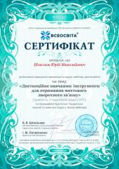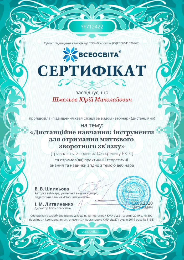 Yuriy Shmelyov, Candidate of Technical Sciences, Deputy Director for Academic Affairs of the Kremenchug Flight College, remotely passed the advanced training in the form of "webinar" on the topic "Distance learning: tools for instant feedback", conducted by Vseosvita LLC. The participant gained theoretical and practical knowledge and skills in the use of tools in educational and managerial activities.