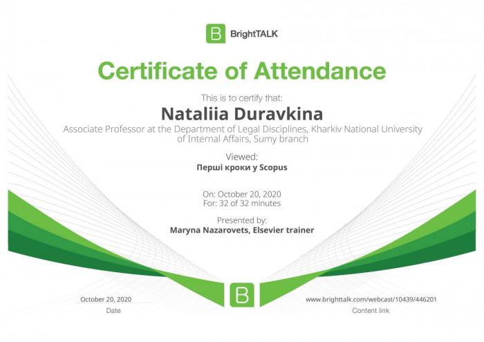 Nataliia Duravkina, Associate Professor of the Department of Legal Disciplines of Sumy Branch of Kharkiv National University of Internal Affairs, took part in the first webinar in the series on “The first steps in Scopus”. Useful information on how to get started with Scopus; learn more about setting up your account to suit your preferences, as well as remote access options to ensure a comfortable working from anywhere in the world were given during the webinar.