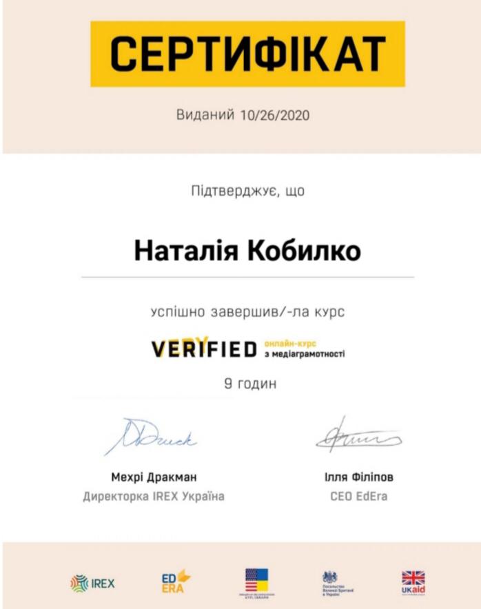 The online course on media literacy has been developed by the international organization IREX together with the online education studio EdEra. It is a part of the project “Learn to Discern in Education (L2D-Ed)”, funded by the Embassy of the United States of America and the Embassy of the United Kingdom in Ukraine with the support of the Ministry of Education and Science of Ukraine. Testing was the form of control, which the lecturer successfully passed and received the corresponding certificate.