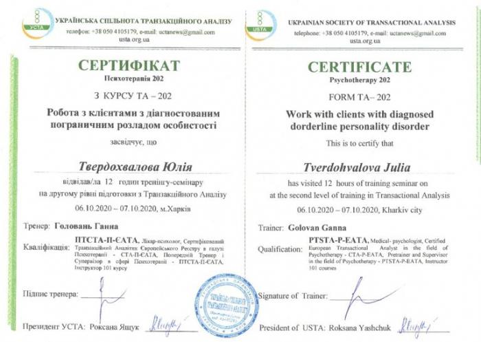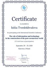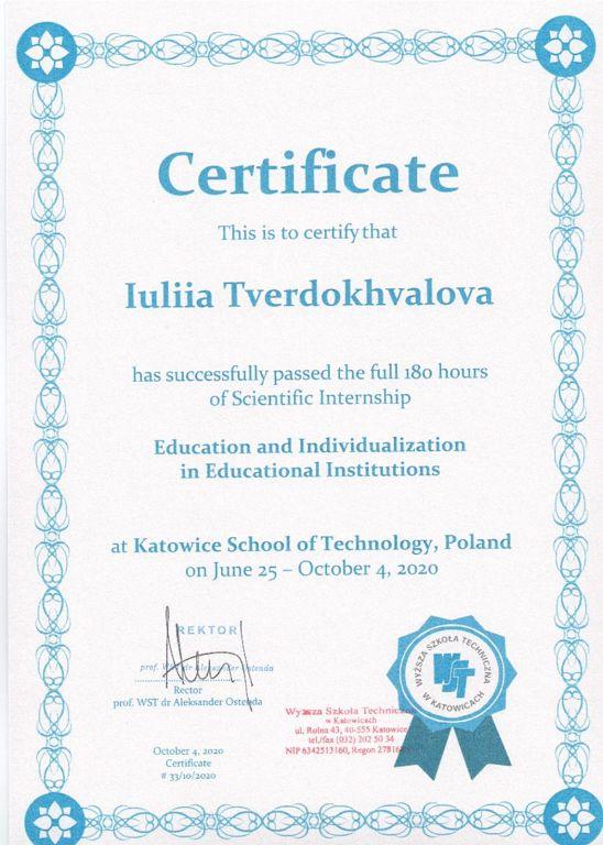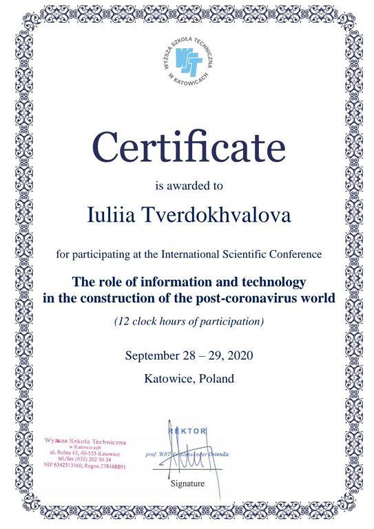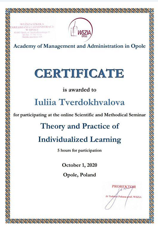 Yuliia Tverdokhvalova, Associate Professor of the Department, took part in the Scientific and Methodical Seminar “Individualized Learning: Theory and Practice (Opole City, the Republic of Poland)”, passed a course “Work with the clients with a diagnosed borderline personality disorder” with the participation in masterclasses / workshops and also passed scientific and pedagogical internship “Education and Individualization in Educational Institutions” at Katowice School of Technology, the Republic of Poland. Yuliia Tverdokhvalova also participated in the International Scientific Conference “The role of information and technology in the construction of the post- coronavirus world” (Katowice City, the Republic of Poland).