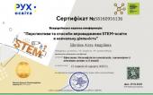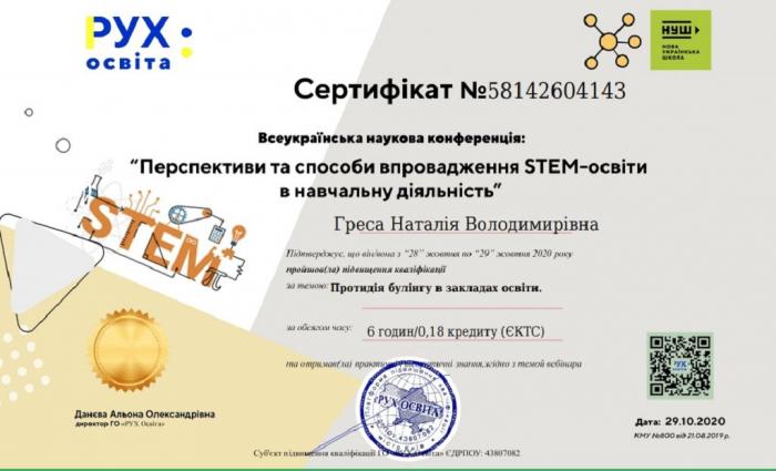 Nataliia Hresa, Associate Professor, participated in the All-Ukrainian Scientific Conference “Prospects and methods of implementing STEM education in the educational activity”: combating bullying in the Educational Institutions; effective and conflict-free communication, behavior patterns of children and their emotions.