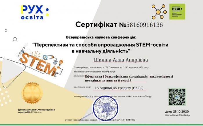 Alla Shylina, Associate Professor, passed the International Online Conference “Psy- expert” , completed the express course “Art- Therapy” at Olha Harkavets Institute of Practical Psychology and improved her skills by participating in the All Ukrainian Scientific Conference “Prospects and methods of implementing STEM education in the educational activity”, “Effective and conflict-free communication, behavior patterns of children and their emotions”.