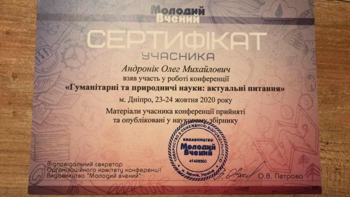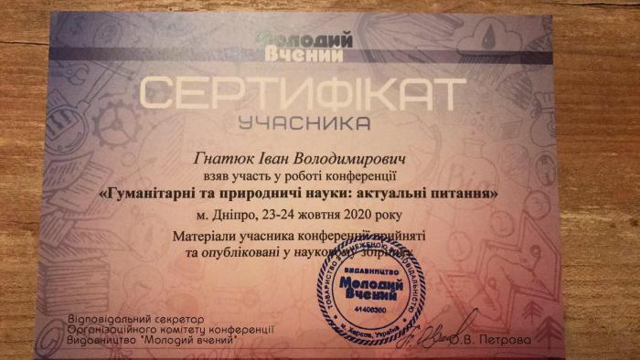 Under the guidance of Professor of the Department of Legal Support of Economic Activity of the Faculty № 6 (Law and Mass Communications), Doctor of Economics Iryna Sievidova, the third-year students Oleh Andronik and Ivan Hnatiuk, studying in speciality 072 "Finance, Banking and Insurance", took part in the II Scientific and Practical Conference "Humanities and Natural Sciences: Current Issues", which was organized by the Publishing House "Young Scientist".