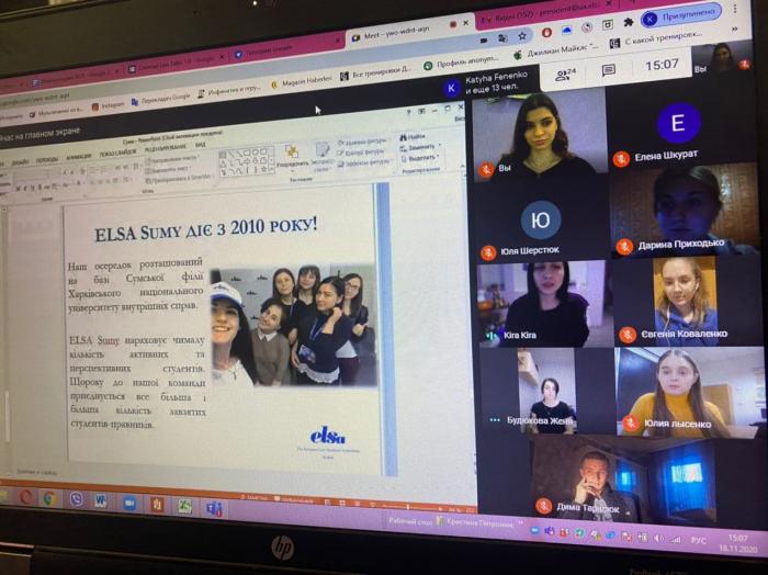 A regular meeting of the board of the local ELSA center was held on the basis of Sumy Branch of Kharkiv National University of Internal Affairs with the help of the GoogleMeet service. ELSA Ukraine action plans for 2020-2021 were discussed at the meeting. In particular, a series of all-Ukrainian webinars, and a visit to Lviv are planned, in which representatives of Sumy Branch and others will become active participants. The president of ELSA Ukraine Kristina Petroniuk joined the discussion, emphasizing the development of international activities of law students.