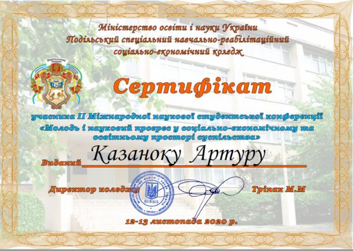 Artur Kazanok, a member of the club “Applied Information Science” of Kremenchuk Flight College of Kharkiv National University of Internal Affairs, in remote mode took part in the II International Scientific Student Conference “Youth and Scientific Progress in the Socio- Economic and Educational Space of Society” held on the basis of the Podolsk Special Educational and Rehabilitation Socio-Economic college.