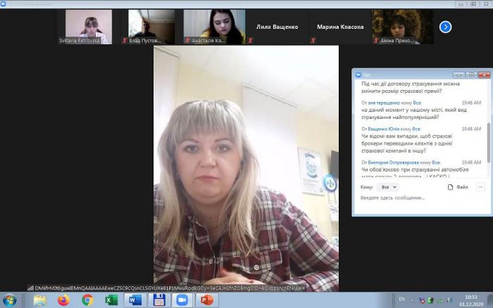 Svitlana Petrovska, Senior Lecturer of the Department of Social and Economic Disciplines of Sumy Branch of Kharkiv National University of Internal Affairs, organized and conducted an online lesson in the Discipline «Insurance» with the participation of Nadiia Ivanytska, Director of the Eastern Regional Office of the Insurance Company «PZU Ukraine», for third-year students.