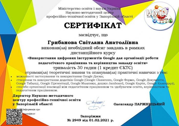 Svitlana Hrybanova, a representative of Kremenchuk Flight College of Kharkiv National University of Internal Affairs, took a distance course “Using Google digital tools to organize the work of a lecturer and the management of an educational institution” conducted by the Scientific and Methodological Center for Vocational Education in Zaporizhzhia region.
