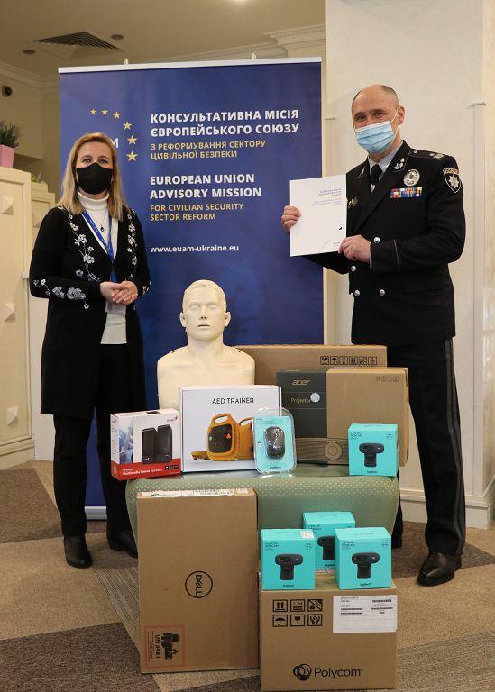 Thus, as part of the implementation of that program, representatives of the European Union Advisory Mission Ukraine donated equipment to the university: a Skype room system camera, a portable projector, a foldable screen for a projector, laptops, a mannequin for CPR with light indicators, web cameras, etc.