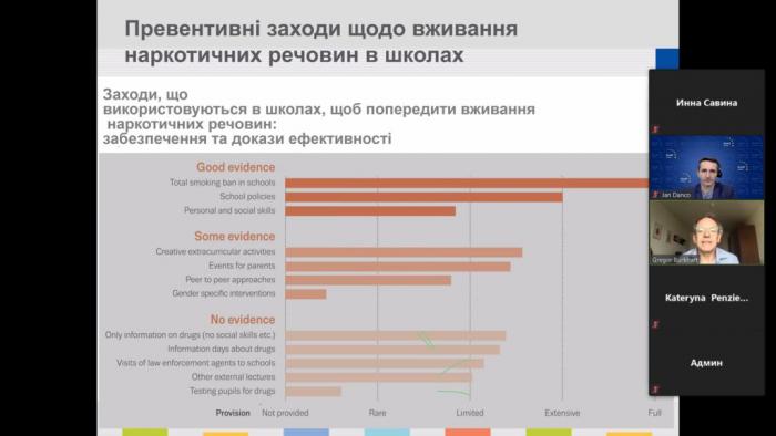 The main speaker of the online event was Gregor Burkhart, a representative of the European Monitoring Center for Drugs and Drug Addiction, who told about the factors that motivate drug use, including minors, provided statistics on drug and alcohol use in previous years, considered the types of addictions, types of control and aspects, which change behavior, highlighted preventive measures and informational approaches which prevent drug use and distribution in the best way. The speaker also told about the experience and practices of EU countries in the field of drug counteraction and noted that this problem remains relevant for European countries.