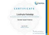Liudmyla Katsalap, a senior researcher of the Research Laboratory on the Issues of Police Activity Ensuring of Kharkiv National University of Internal Affairs, successfully completed «Gender-based Violence: module version 2.3» course on LEEd CEPOL online educational platform. The course covered topics related to forms of gender-based violence, priority actions of police officers in such cases, particular, issues of interaction with victims. The participants of the course were acquainted with the experience of the European Union countries in preventing and counteracting gender violence.