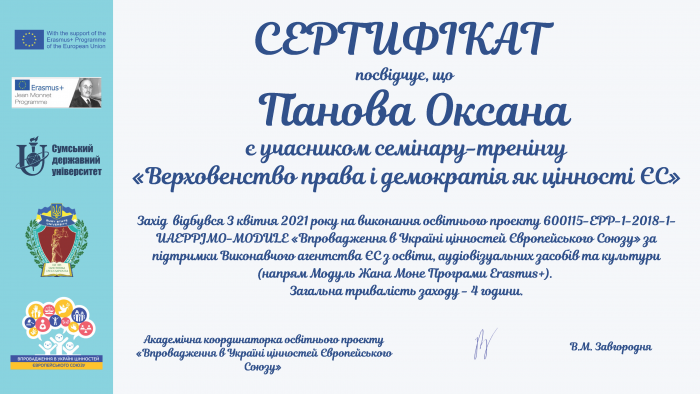The seminar was held on the basis of Sumy State University within the framework of the educational project "Enforcement of European Union Values in Ukraine" with the support of the EU Education, Audiovisual and Culture Executive Agency ( Jean Monnet Module direction of the Erasmus + program).