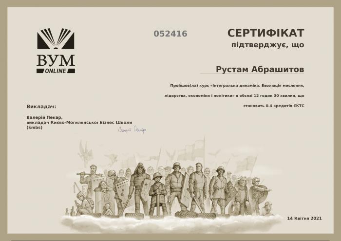 Rustam Abrashytov, Head of the International Relations and Interuniversity Work Department of Kremenchuk Flight College of Kharkiv National University of Internal Affairs, took the online Integral Dynamics. The Evolution of Thinking, Leadership, Economics and Politics advanced training course and received a certificate.