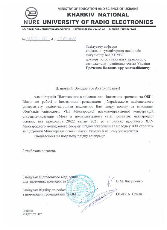 The Department of Social and Humanitarian Disciplines of the Faculty №6 of KhNUIA together with the Department of Natural Sciences of NURE remotely held the VIII International Scientific and Practical Conference of Foreign Listeners and Students "Language in a Multicultural World: Development of International Education". Volodymyr Hrechenko, Doctor of Historical Sciences, Professor, Head of the Department of Social and Humanitarian Disciplines, co-chaired the conference. Nataliia Kobylko, Candidate of Philology, Senior Lecturer, joined the organizing committee.