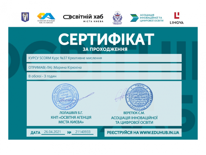 Maryna Kiriukhina, Head of the Department of Social Sciences and Humanities and Physical Training, Candidate of Pedagogical Sciences of Kremenchuk Flight College, participated in the Creative Thinking online course developed by soft skills trainer Iryna Rudyka on the Educational Hub platform.