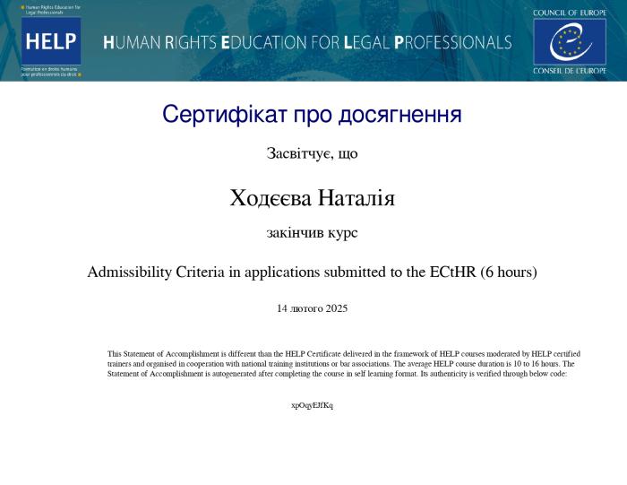 За такою темою курсантка ННІ №2 Аліна ІЛЬЯШОВА пройшла онлайн-курс на освітній платформі HELP «Human Rights Education for Legal Professionals». Програма навчання охоплювала ключові аспекти концепції перехідного правосуддя, механізми захисту прав людини у періоди суспільних трансформацій тощо.