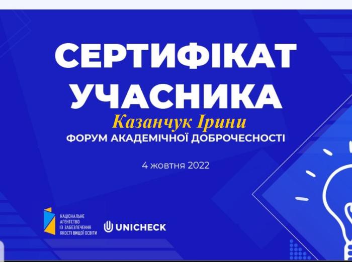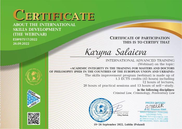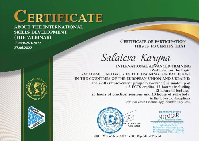 Доцентка кафедри теорії та історії держави і права факультету № 1 Харківського національного університету внутрішніх справ Олена Юшкевич пройшла онлайн-курс «Академічна доброчесність» та отримала навички з формування культури академічної доброчесності в межах проєкту сприяння академічній доброчесності в Україні (SAIUP) Американські Ради з міжнародної освіти.