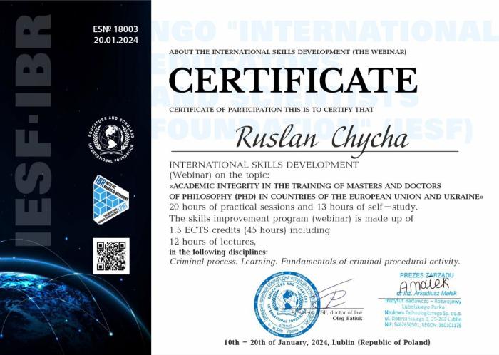 Доцентка кафедри гуманітарних дисциплін Сумської філії ХНУВС Ганна Довгополова пройшла онлайн-навчання «Академічна доброчесність: онлайн-курс для викладачів» від American Councils for International Education. Учасники ознайомилися з теоретичними основами й дієвими інструментами академічної доброчесності.