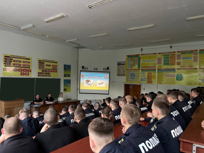 Виховну годину із курсантами ННІ №1 щодо ролі науки у підготовці кадрів для Національної поліції провів куратор, професор кафедри цивільного, трудового та господарського права, доктор юридичних наук, професор Святослав Сліпченко.