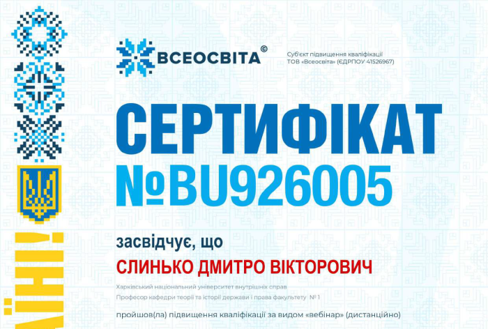 Викладачка кафедри кримінального процесу та організації досудового слідства Ірина Нечаєва разом із курсантами кураторської групи факультету №1 пройшла онлайн-курс «6 кроків до доброчесності: від теорії до практики» на навчальній платформі Національного агентства з питань запобігання корупції.
