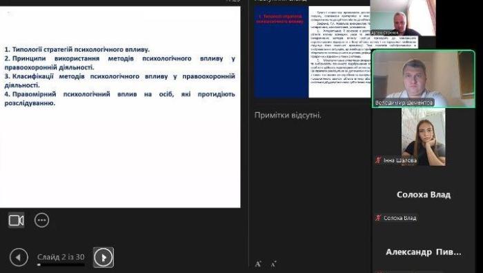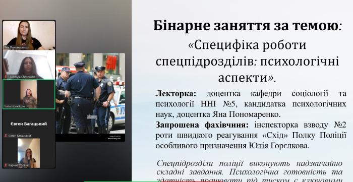 Професорка кафедри психології, соціології та педагогіки Наталя Мілорадова, старший психолог сектору КЗ Полтавського РУП ГУНП у Полтавській області Яна Комар разом із курсантами 4 курсу ННІ №3 розглянули особливості екстремальних і кризових ситуацій, з наслідками яких працює психолог.