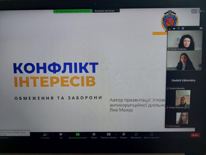 Уповноважена з антикорупційної діяльності Яна Мазур спільно з завідувачем відділення моніторингу відділу кадрового забезпечення, підполковником поліції Сергієм Терницьким у межах службової підготовки провели навчання для працівників університету, які мають спеціальні звання поліції на тему «Забезпечення доброчесності у діяльності поліції. Фінансовий контроль».