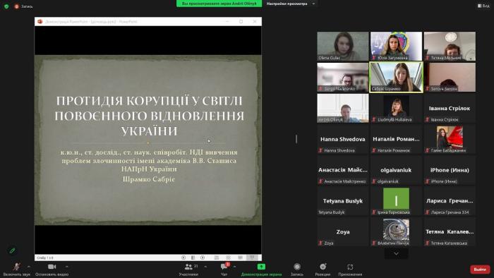 Професорка кафедри теорії та історії держави і права Юлія Загуменна взяла участь у вебінарі «Уроки антикорупційної політики ЄС для сталого розвитку громадянського суспільства України». Під час вебінару було розглянуто особливості антикорупційної політики Європейського Союзу, визначено пріоритетні напрями національної антикорупційної політики у світлі євроінтеграційних процесів, розвитку громадянського суспільства та повномасштабної війни.