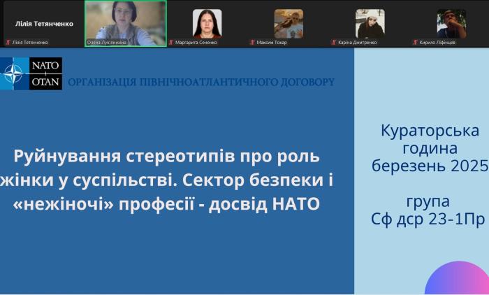 Професорка кафедри соціально-економічних дисциплін Сумської філії ХНУВС Олена ЛУК’ЯНИХІНА за цією темою провела кураторську годину для студентів. Вона зазначила, що країни НАТО впроваджують Резолюцію Ради Безпеки ООН 1325 «Жінки, мир, безпека».